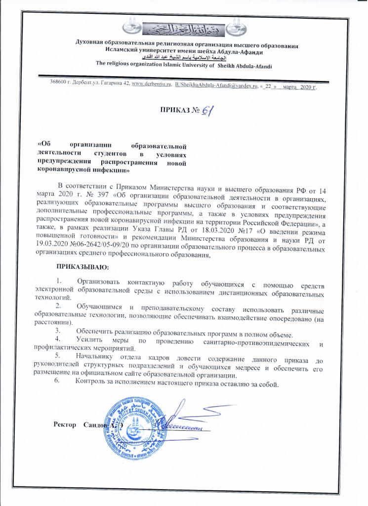 Приказ №61 Исламский Университет